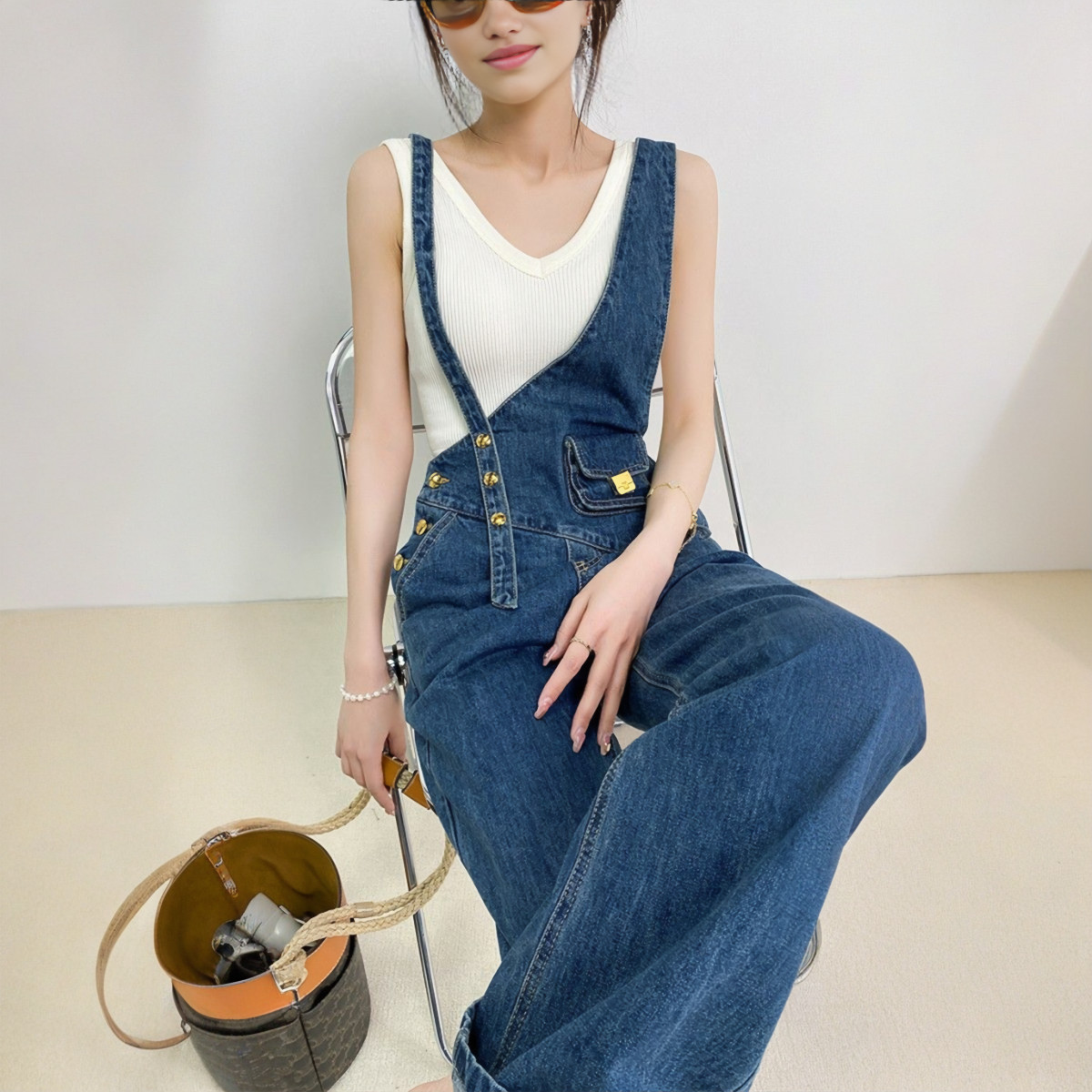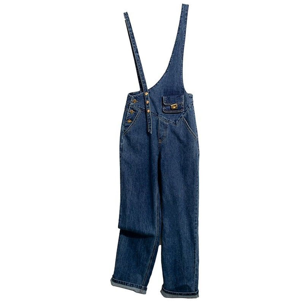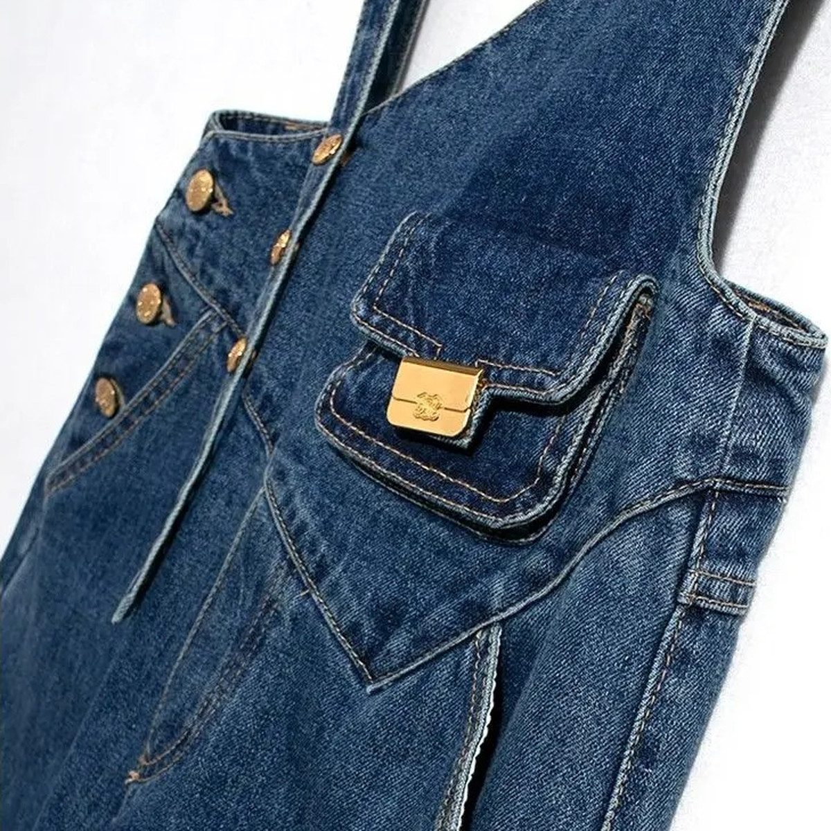 Cette salopette en denim capte tous les regards avec sa coupe asymétrique audacieuse. Le détail qui change tout ? Son jeu de bretelles décalées et sa poche plaquée avec fermoir doré, pour une touche arty, mêlant vintage et design iconique.