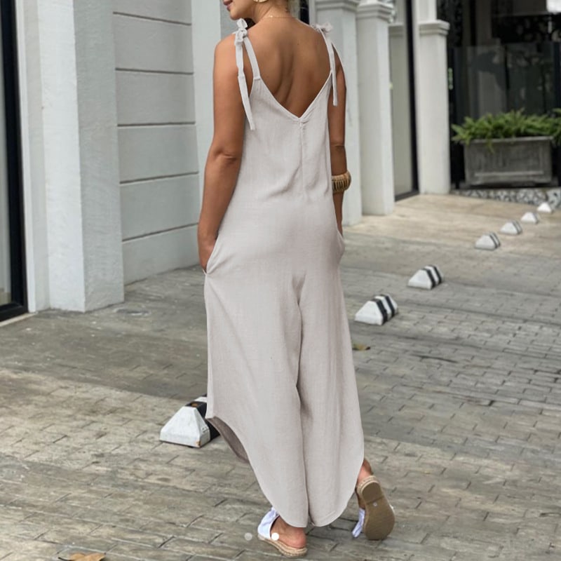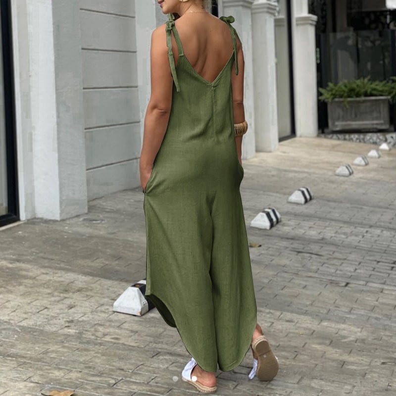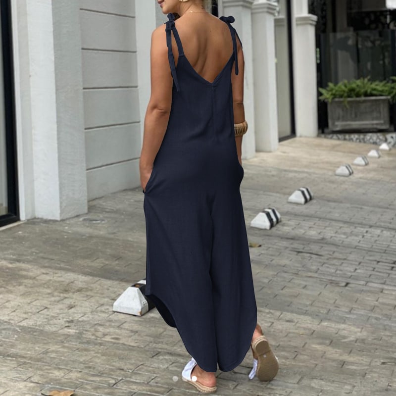 Vous pourrez ajuster le tombé du décolleté et la longueur de notre salopette sarouel asymétrique grâce aux bretelles qui se nouent à votre convenance. Le devant et le dos ont un décolleté en V pour une touche très féminine et glamour qui mettra votre poitrine et votre dos en valeur élégamment.
